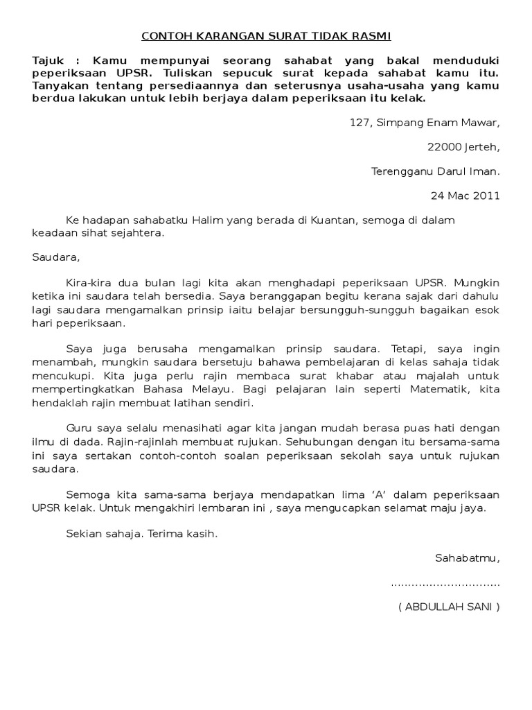 Karangan jenis surat tidak rasmi. Surat Kiriman Rasmi Tidak Hadir ke SekolahUjian Pentaksiran Sekolah Rendah. Ucapan Syarahan Perbahasan.